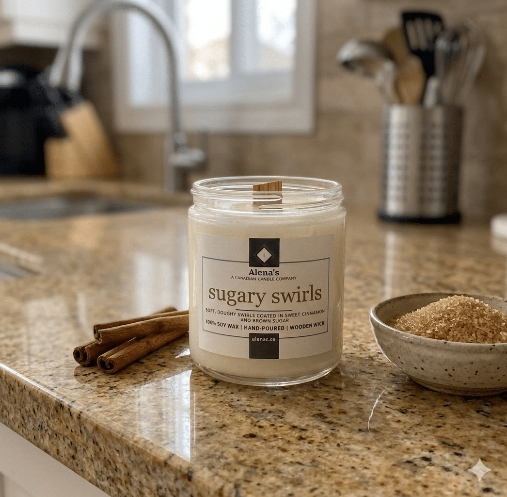 Sugary Swirls like a Cinnamon Bun, only it lasts longer. Alena’s Sugary Swirls candles carry the scent of fresh-baked cinnamon rolls with cinnamon & buttery icing sugar.